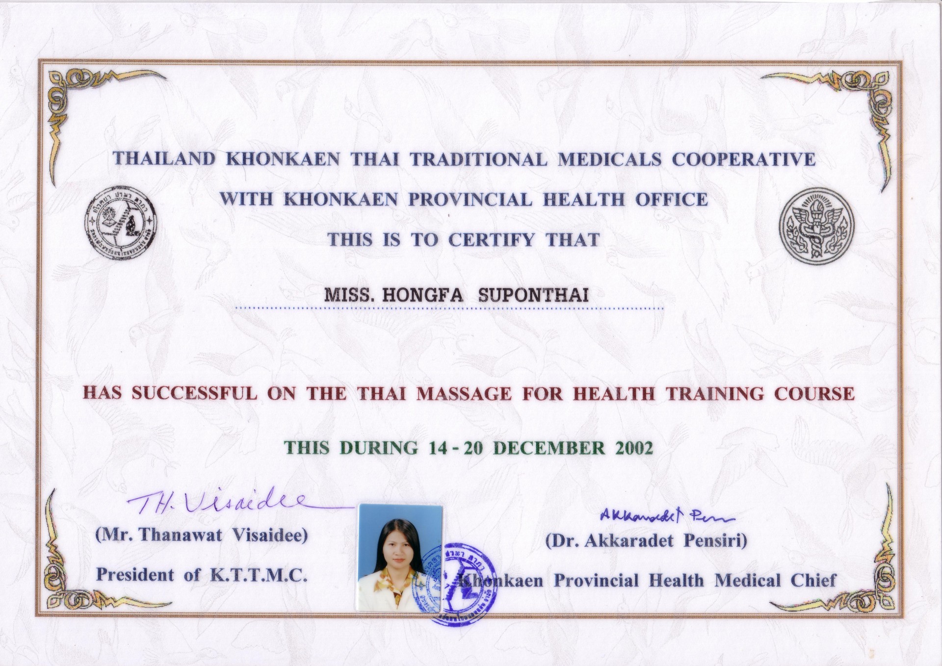 Bereits im Dezember 2002 habe ich nach erfolgreicher Ausbildung mein erstes Zertifikat für Thai Massage vom Gesundheitsamt der Provinz Khon Kaen erhalten. Im Juni 2010 habe ich weitere Ausbildungen erfolgreich absolviert.